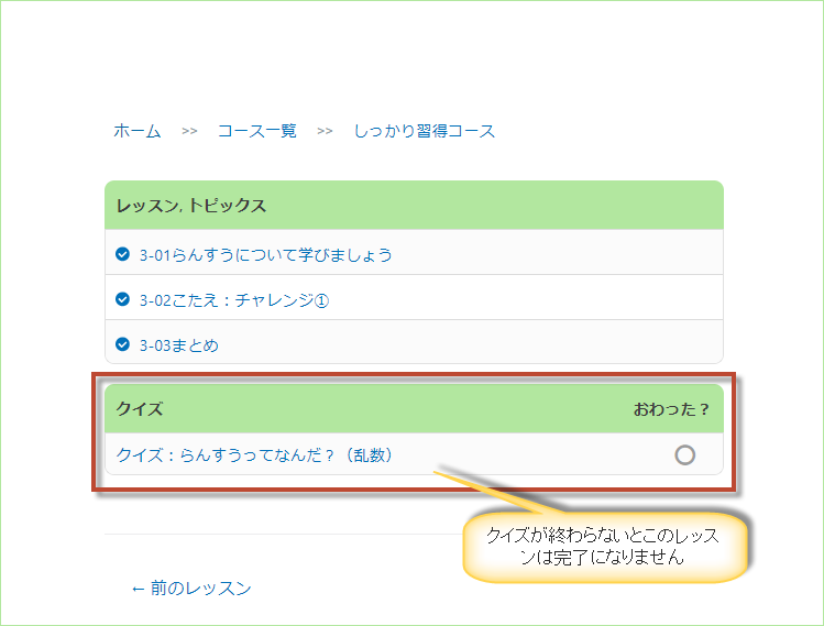 ・トピックを全て視聴(しちょう)したのにレッスンが完了になりません02_FAQ、05_すべての情報 / By tios レッスンに含まれるトピックの動画を全て視聴(しちょう)しおわっても、最後(さいご)もしくは、途中(とちゅう)にあるクイズに 合格(ごうかく)しないとそのレッスンを完了する事はできません。 クイズに挑戦(ちょうせん)し、合格して下さい。 この投稿は役に立ちましたか? YES! NO! 0人中0人がこの投稿は役に立ったと言っています。
