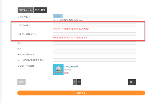 2-12-2.アカウントページからパスワードを変更する パスワード変更は、アカウントページからも行う事ができます。 ヘッダーメニュー「アカウント」より、「プロフィール」をクリックして下さい。 変更されたい「新しいパスワード」を入力してパスワードを入力してください。 更新ボタンをクリックしてください
