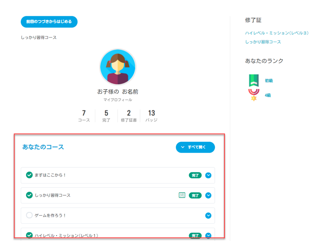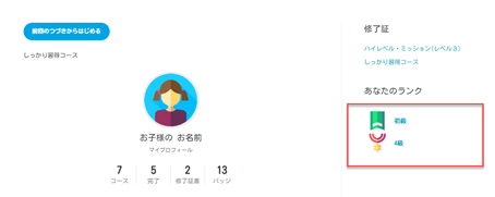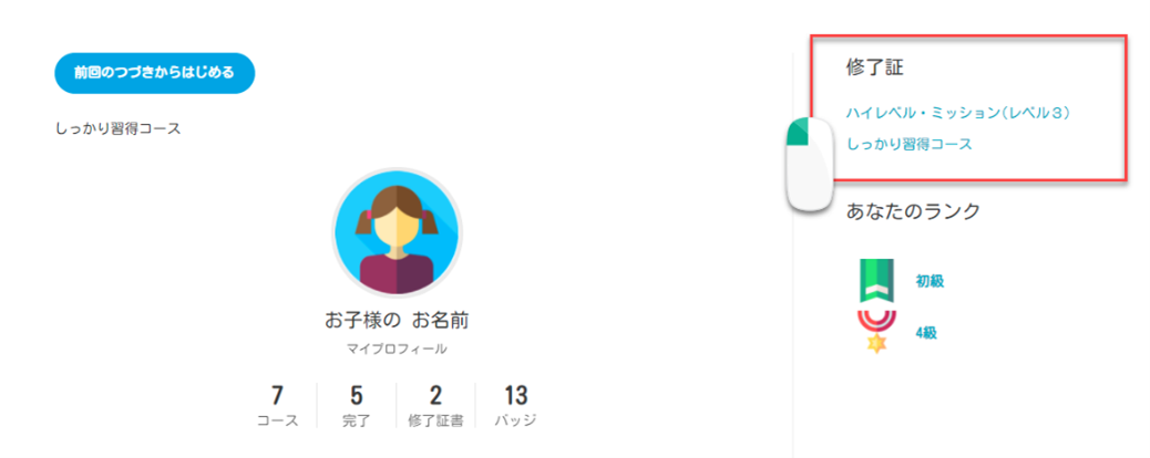 修了証の確認は、上記赤枠のアイコンもしくは、画面右側の修了証枠に表示された、コース名をクリックしてください。